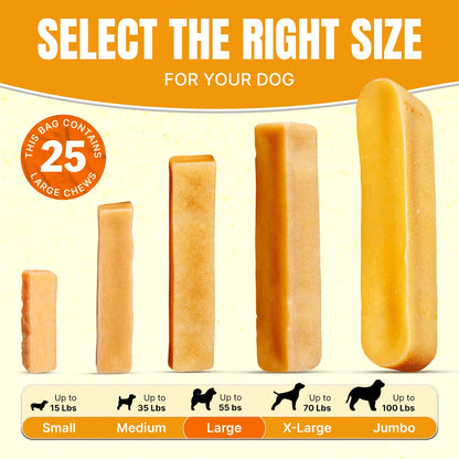 Made for Retrievers, Bulldogs, Border Collies, and similar breeds. Large yak chews in bulk 5 lbs bags — about 20–25 sticks per pack.