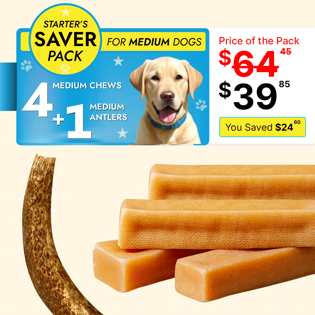 For just $39.85, get a starter pack valued at $64.45. This starter pack contains 4 sticks of yak cheese chew for medium dogs and 1 pack of medium elk antlers.