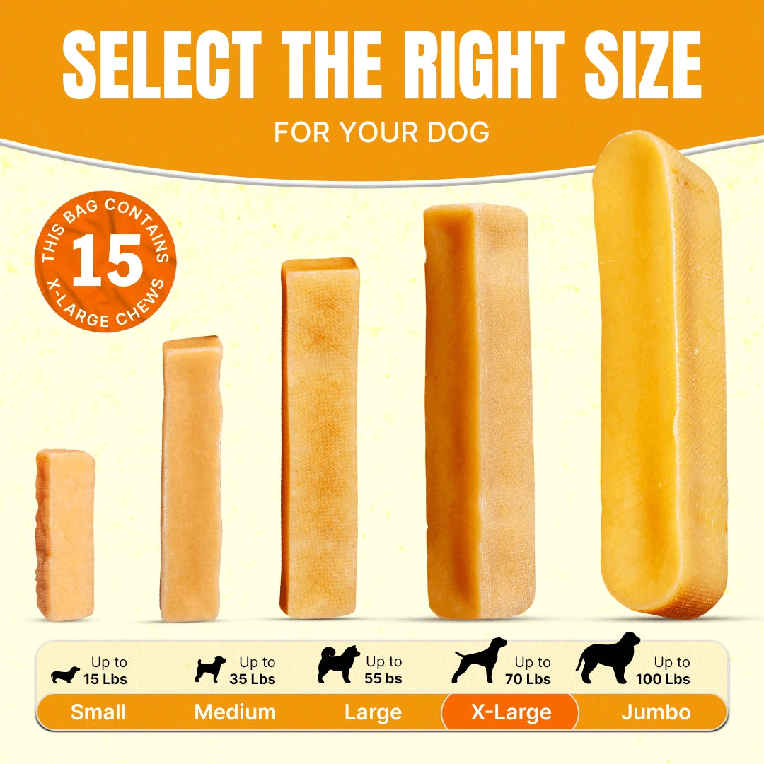Best for German Shepherds, Boxers, Dobermanns, and Huskies. These extra-large yak chews come in bulk (5 lbs) bags with 15 chews.